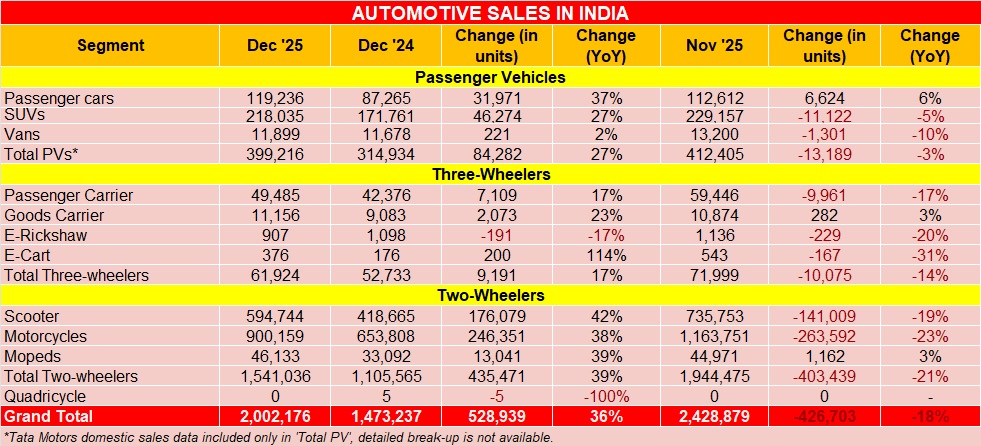 As per the latest sales data released by the Society of Indian Automobile Manufacturers (SIAM), the apex body representing the automotive industry in the country, more than 2 million vehicles were sold in the last month of 2025, which marked a 36 percent YoY growth. During the period, passenger vehicle sales came at 399,216 units, up 27 percent YoY, three-wheelers at 61,924 units, up 17 percent YoY and two-wheelers at 1.54 million units, up 39 percent YoY.