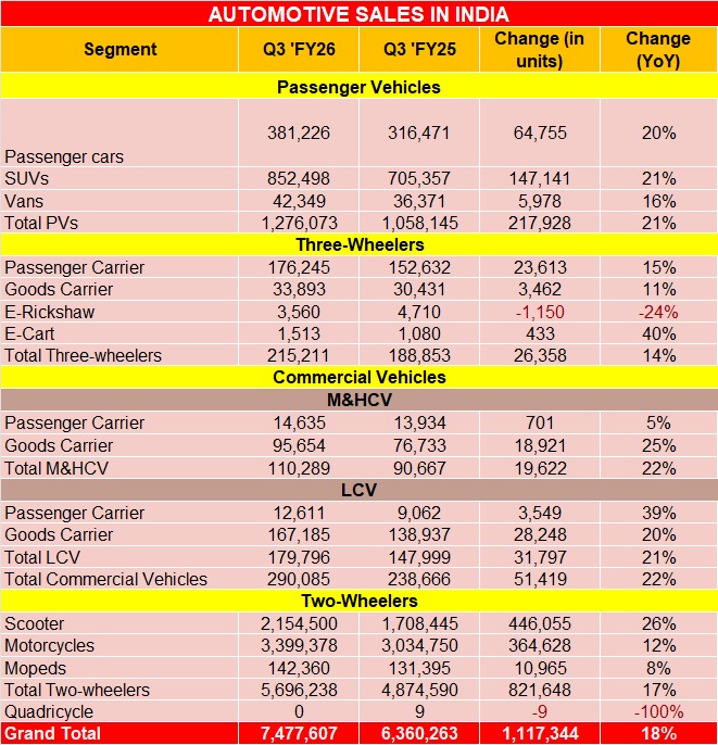 Furthermore, for Q3 FY2026, a total of 7.47 million vehicles were sold in the country, which was 18 percent higher compared to same period last year. The passenger vehicle segment led by SUV demand saw over 1.2 million units sold, up 21 percent YoY. Three-wheeler segment registered 14 percent YoY growth with 215,211 units wholesales.