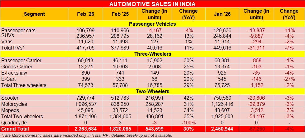 The automotive industry witnessed its best-ever sales for the month of February with a record 2.36 million vehicles sold across categories last month, which marks a 30 percent YoY growth as per the latest data shared by the Society of Indian Automobile Manufacturers (SIAM). For context, in February 2025, a total of 1.82 million vehicles were sold.