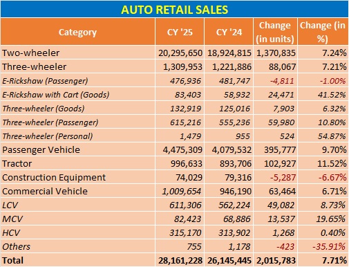 The Federation of Automobile Dealers Associations (FADA), the apex body representing automobile dealers in the country, recently released retail sales data for the 2025 calendar year, reporting total registrations of 2,81,61,228 units, which was 7.71 percent higher over the 2,61,45,206 units recorded in 2024.